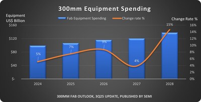 PHOENIX, Oct. 9, 2025 /PRNewswire/ — SEMICON West — Global 300mm fab equipment spending is expected to reach $374 billion from 2026 to 2028, SEMI reported today in its latest 300mm Fab Outlook. This robust investment reflects fab regionalization and surging AI chip demand for data centers and edge devices, while underscoring the growing commitment to semiconductor self-sufficiency across key regions through localized industrial ecosystems and supply chain restructuring.