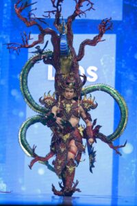 Khupee, the Thai designer of this costume, has a strong connection to Laos, having previously created outfits for several Lao pageant contestants, including the Miss Universe Laos 2018 national costume, which also won Best Costume.