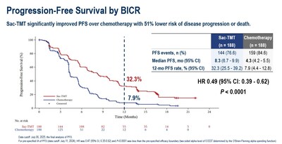 As at the data cut-off date July 06, 2025, the median follow-up is 18.9 months. the median Progression-Free Survival (PFS) was 8.3 months in the sac-TMT group and 4.3 months in the chemotherapy group. Sac-TMT significantly improved PFS over chemotherapy with 51% lower risk of disease progression or death (hazard ratio (HR) 0.49; 95% confidence interval (CI), 0.39-0.62; P<0.0001).