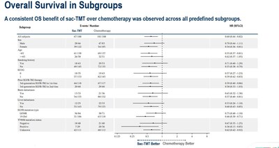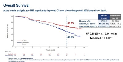 At the preplanned interim analysis of overall survival (OS), the OS was not reached (NR) in the sac-TMT group and 17.4 months in the chemotherapy group. sac-TMT significantly improved OS over chemotherapy with 40% lower risk of death (hazard ratio (HR) 0.6; 95% CI: 0.44-0.82; two-sided P=0.001). In the supplemental analysis, when censoring patients at the date of initiation of subsequent ADCs, sac-TMT significantly improved OS over chemotherapy with 44% lower risk of death (HR, 0.56; 95% CI, 0.41 – 0.77).