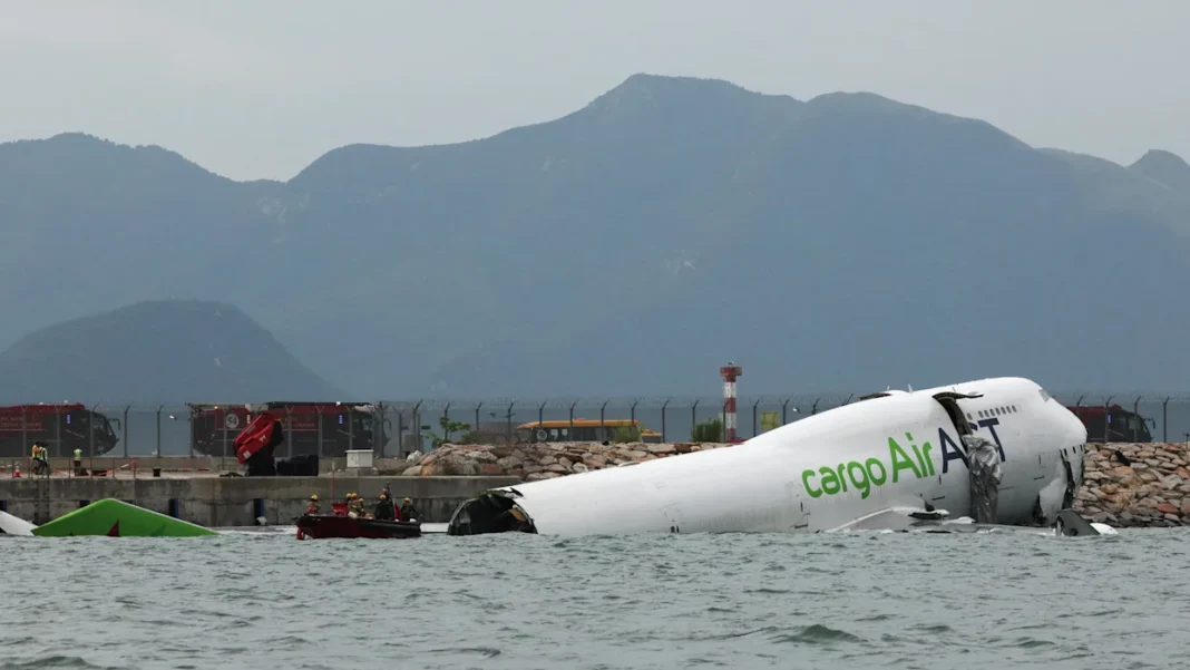A B744 cargo plane arriving from the United Arab Emirates “deviated from the North Runway after landing and ditched into the sea”, Hong Kong’s Civil Aviation Department said in a press release.