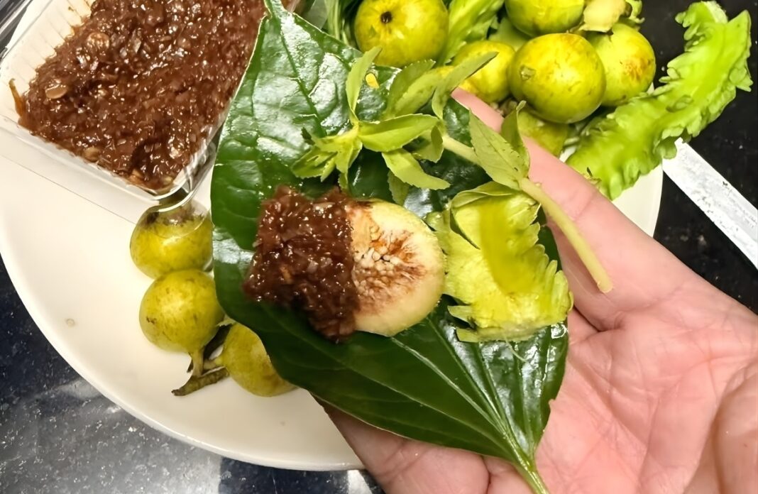 The latest craze, Mieng Mark Duea, features fillings wrapped in tender cluster fig leaves. Each portion combines cluster fig, winged bean, rice paddy herb, and wild betel leaf, all tied together with a fragrant lemongrass sauce that highlights the dish’s fresh taste.